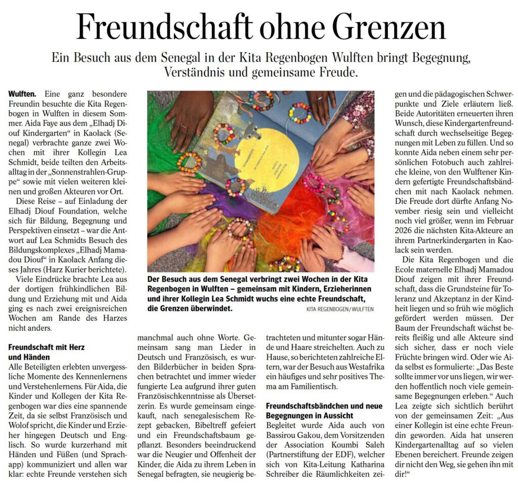 Begleitet wurde Aida auch von Bassirou Gakou, dem Vorsitzenden der Association Koumbi Saleh (Partnerstiftung der EDF), welcher sich von Kita-Leitung Katharina Schreiber die Räumlichkeiten zeigen und die pädagogischen Schwer-punkte und Ziele erläutern ließ. Beide Autoritäten erneuerten ihren Wunsch, diese Kindergartenfreundschaft durch wechselseitige Begegnungen mit Leben zu füllen. Und so konnte Aida neben einem sehr persönlichen Fotobuch auch zahlreiche kleine, von den Wulftener Kindern gefertigte Freundschaftsbändchen mit nach Kaolack nehmen. Die Freude dort dürfte Anfang November riesig sein und vielleicht noch viel größer, wenn im Februar 2026 die nächsten Kita-Akteure an ihrem Partnerkindergarten in Kaolack sein werden. Die Kita Regenbogen und die Ecole maternelle Elhadj Mamadou Diouf zeigen mit ihrer Freundschaft, dass die Grundsteine für Toleranz und Akzeptanz in der Kindheit liegen und so früh wie möglich gefördert werden müssen. Der Baum der Freundschaft wächst bereits fleißig und alle Akteure sind sich sicher, dass er noch viele Früchte bringen wird. Oder wie Aida selbst es formulierte: „Das Beste sollte immer vor uns liegen, wir werden hoffentlich noch viele gemeinsame Begegnungen erleben.“ Auch Lea zeigte sich sichtlich berührt von der gemeinsamen Zeit: „Aus einer Kollegin ist eine echte Freundin geworden. Aida hat unseren Kindergartenalltag auf so vielen Ebenen bereichert. Freunde zeigen dir nicht den Weg, sie gehen ihn mit dir!“
