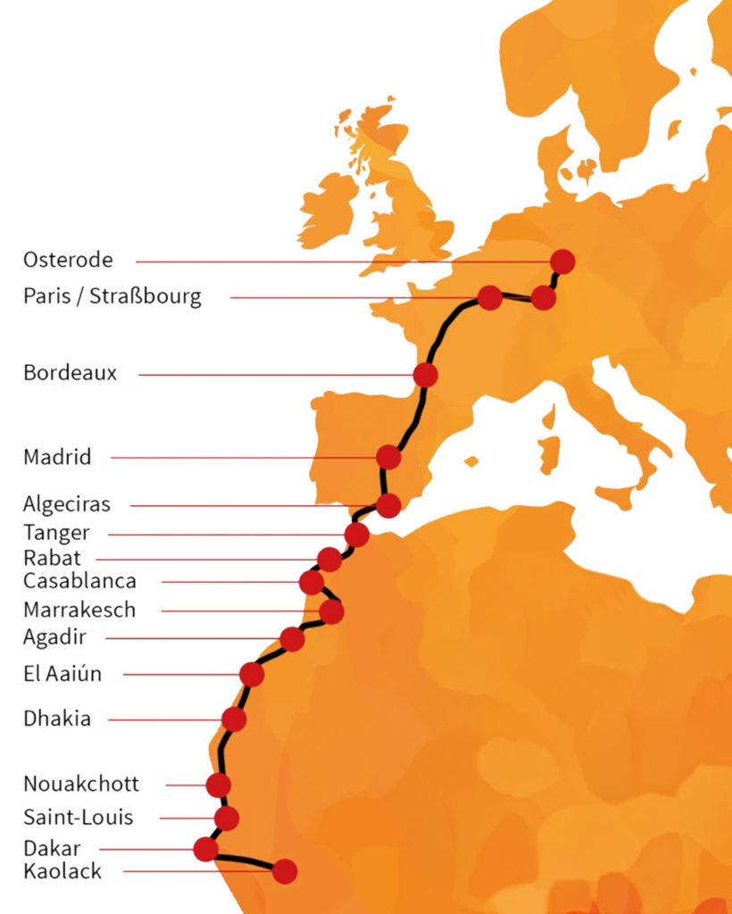 Jeder Mensch, der möchte, kann uns für einen oder viele Kilometer begleiten auf einer Strecke durch mehrere Länder (Senegal, Mauretanien, Westsahara, Marokko, Spanien, Frankreich, Deutschland) mit unzähligen Höhenmetern und zahlreichen Herausforderungen. Wir wollen inspirieren, Menschen zusammenbringen und ein Zeichen setzen: